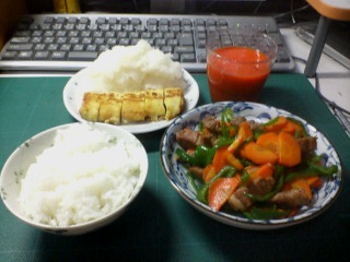 今日は豚肉とピーマンと人参の炒め物と玉子焼き+大根おろしと野菜ジュースでした